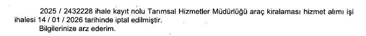 Tarımsal Hizmetler Müdürlüğü araç kiralaması hizmet alımı işi hizmet alımı 4734 sayılı Kamu İhale Kanununun 19 uncu maddesine göre açık ihale usulü ile ihale edilecektir.