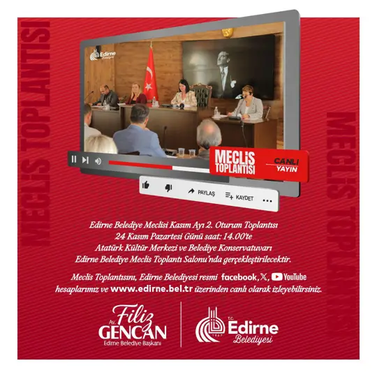 Edirne Belediye Meclisi I. Olağanüstü Toplantısı Edirne Belediye Başkanı Av. Filiz Gencan’ın başkanlığında; 17 Ekim Cuma Günü Saat: 14.00'te Atatürk Kültür Merkezi ve Belediye Konservatuvarı Edirne Belediye Meclisi Toplantı Salonu'nda gerçekleştirilecektir.