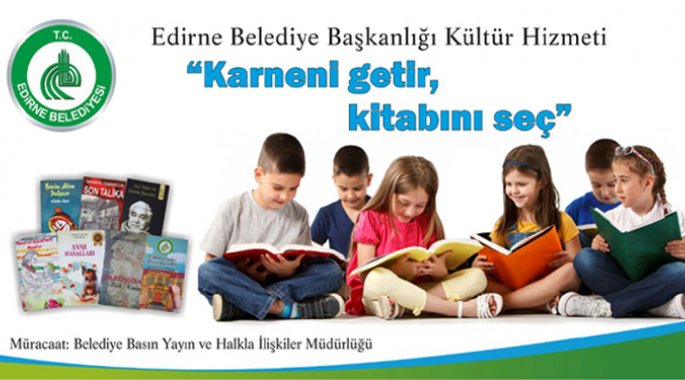 Öğrencilerin eğitim ve öğretim faaliyetlerine destek olan Edirne Belediyesi, 2015 - 2016 Eğitim-Öğretim yılının sona ermesiyle birlikte öğrencilerin küçük yaşta kitap okuma alışkanlığı kazanması için yeni bir kampanyaya daha imza attı. 2015 - 2016 Eğitim-Öğretim Yılı’nda aldığı karnesini Edirne Belediyesi Basın Yayın ve Halk İlişkiler Müdürlüğü’ne getiren anaokul, ilkokul, ortaokul ve lise öğrencileri Edirne Belediyesi’nin kendileri için hazırladığı 7 kitaptan birini seçebilecek.