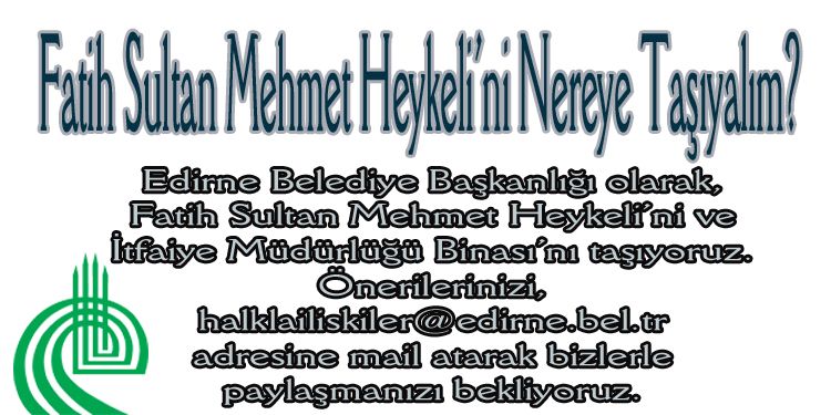 Edirne Belediye Başkanlığı olarak göreve geldiğimiz ilk günden bu yana, kentimiz adına her türlü kararı halkımızla birlikte almaya devam ediyoruz. Edirne Belediye Başkanlığı olarak, Edirne Halkı’na ‘Fatih Heykeli’ni nereye taşıyalım? diye soruyoruz. Siz halkımızdan gelen öneriler doğrultusunda, Edirne tarihinde çok önemli bir yere sahip Fatih Sultan Mehmet’in heykelini şimdiki yerinden alıp, daha uygun bir yere taşıyacağız. Siz değerli halkımızın da bildiği gibi, Fatih Sultan Mehmet’in heykelinin şu anda bulunduğu alan şahsa aittir. Edirne Belediyesi olarak, Fatih Sultan Mehmet’in heykelini oradan alarak, daha uygun, daha güzel bir alana yerleştirmeyi planlıyoruz. Kentimiz için önemli olan bu kararı da siz değerli halkımızla birlikte vermek istiyoruz. Önerilerinizi, halklailiskiler@edirne.bel.tr adresine mail atarak bizlerle paylaşmanızı bekliyoruz."Edirne Belediye Başkanlığı olarak, Fatih Sultan Mehmet Heykeli’ni ve İtfaiye Müdürlüğü Binası’nı taşıyoruz.