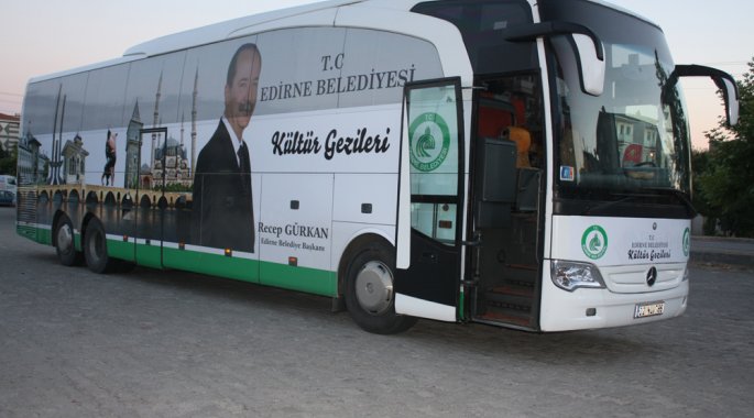 Kültür Gezilerini kapsamında vatandaşları İstanbul’a taşıyan otobüs ise, Edirne’nin simgeleri olan Selimiye, Pehlivanlar, Adalet Kasrı, Tarihi Köprüler, Lozan Anıtı, Protokol Evi ve Eski Tren Garı’nın fotoğraflarıyla süslendi.